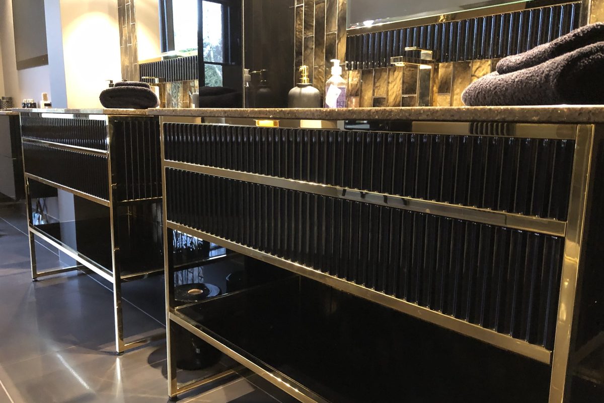 When we initially came to survey the work, the customer was quite specific about the boutique feel she wanted to achieve. With this in mind Potts Ltd designed the room with a large walk-in shower, a large luxurious bath, Italian black high gloss vanity units, gold plated taps and fixtures, set off with a variety of gold and bronze coloured tiles. A curved wall was cleverly designed and constructed to add a feature to a room already full of features, which breaks up the room up somewhat and add some privacy to the bathing area.