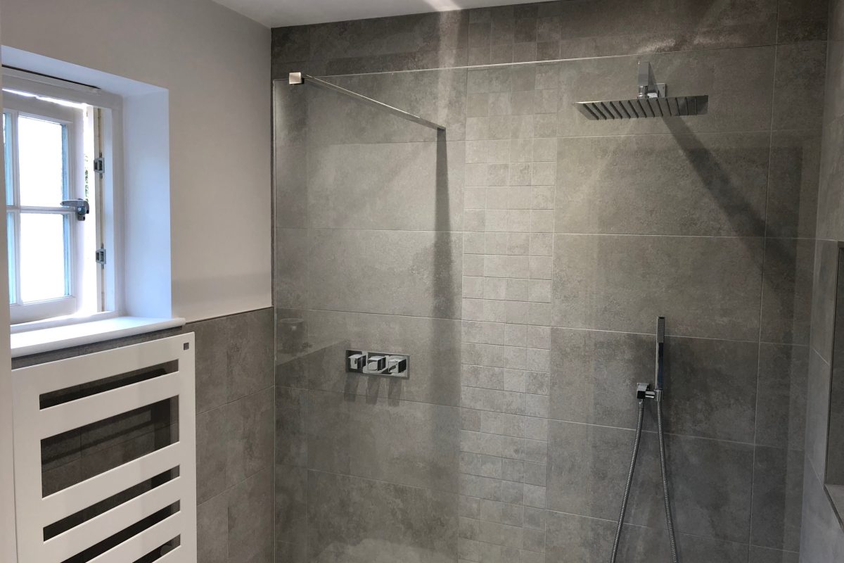We worked with Potts Ltd to update both rooms, the ground floor cloakroom with wall hung W.C., vanity basin along with a radiator and a neat mirrored alcove above the basin. As you can see the room was made extra special by the customers choice of feature tiles, not easy to fit but definitely worth it.